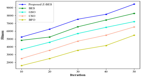 Fitness values for the proposed Z-BES and existing Bald Eagle Search (BES), Galactic Swarm Optimization (GSO), Cockroach Swarm Optimization (CSO), and Bacterial Foraging Optimization (BFO) with various iterations (10, 20, 30, 40, and 50) are presented in Figure 6. The proposed Z-BES algorithm attains increased fitness over iterations (5236–9451) as it enhances convergence by providing a more suitable measure for area selection during optimization.
