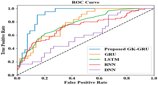 The receiver operating characteristic (ROC) curve for the proposed GK-GRU and the existing techniques is depicted in Figure 7. A higher area under the ROC curve indicates that the GK-GRU model has a better ability to correctly classify positive cases while minimizing false positives, reflecting its strong discriminatory power and efficiency in evaluating test cases.