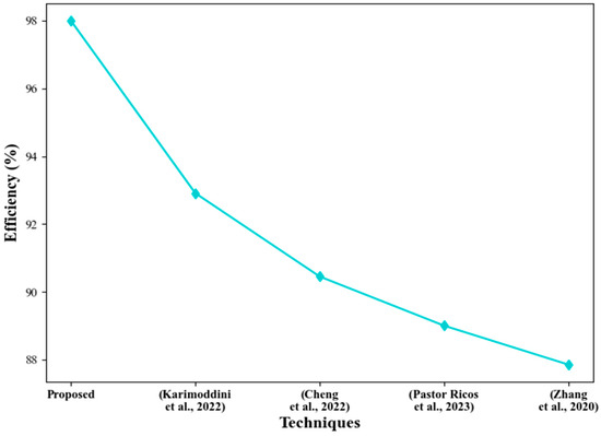 Figure 8 compares the efficiency of the proposed GK-GRU and the existing techniques. The Z-BES prioritizes methodology and facilitates the concentration of testing efforts on crucial areas, effectively distributing resources and promptly addressing significant concerns. Additionally, the GK-GRU model improves the learning capabilities inside the system, addressing issues such as reduced efficiency and prolonged training durations. This adaptation contributes to enhanced overall efficiency. The proposed model has an efficiency rate of 98%, whereas that of all other associated techniques is 90%. Thus, the proposed system retains better performance than the other state-of-the-art techniques.