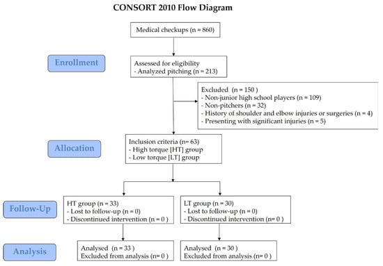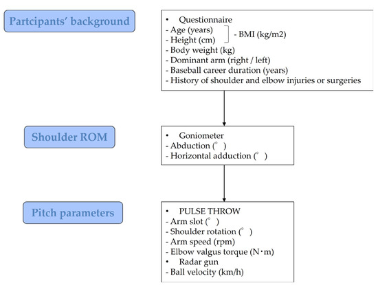 The inclusion criteria consisted of junior high school pitchers measured for pitching during medical checkups. Excluded from eligibility criteria included those with a history of significant injuries or surgery to the shoulder or elbow and those having a significant injury present on examination (Figure 2). All examinations were conducted at the end of the season medical checkup. The experimental flow chart and measurement parameters are shown in Figure 3.