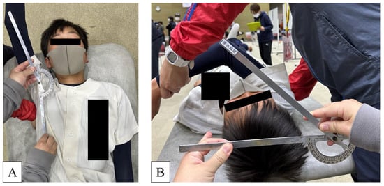 Passive shoulder ROMs in both abduction and horizontal adduction were examined using a conventional procedure encouraged by the American Academy of Orthopaedic Surgeons [24], placing the participants supine on a portable examination table and using a goniometer (Figure 4). In measuring shoulder abduction ROM, the first investigator immobilized the subject’s scapulothoracic joint by restraining the subject’s scapula with one hand, and passively induced shoulder joint abduction with the other hand until resistance was felt. The angle of abduction was measured by the second investigator as the angle between the long axis of the trunk and the upper arm. Horizontal adduction was similarly assessed with the scapulothoracic joint fixed. The humerus was then horizontally adducted while maintaining neutral rotation of the humerus until resistance was felt. The angle of horizontal adduction was measured as the angle between the horizontal plane and the long axis of the humerus. Shoulder ROM was recorded prior to performing the pitching exercises. As in the previous report, each measurement was taken twice, and the mean values were used for analysis [25]. The difference between the dominant and non-dominant shoulders’ ROM was also evaluated. The difference between the dominant and non-dominant shoulders’ ROM was defined as the following: