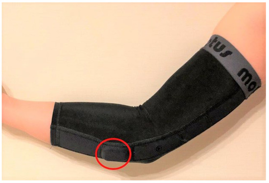 The compression arm sleeve with the elbow torque sensor (red circle) positioned 5 cm distal to the medial epicondyle of the humerus.