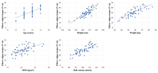 Correlations with elbow stress. Elbow valgus torque was significantly positively correlated with age, height, weight, body mass index (BMI), and ball velocity.