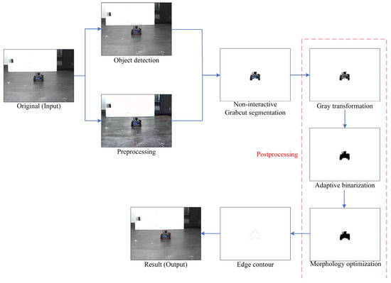 - Segmentation postprocessing. The segmentation postprocessing includes gray transformation, adaptive binarization and morphological optimization. The adaptive binarization threshold is generated automatically based on the background pixel value set after foreground segmentation.