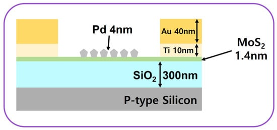 Previous researchers were interested in two-dimensional (2D) materials, which are now attracting attention in various scientific fields due to their unique structural, electronic, and mechanical properties. Graphene, in particular, is a subject of extensive research due to graphene’s excellent properties within the domain of 2D materials. However, the application of graphene as a sensor is limited in certain situations due to the difficulty in controlling its band gap [6]. For this reason, MoS2 has received a lot of attention because its bandgap is adjustable. MoS2 is connected by a relatively weak van der Waals force. This means that the gas molecules can freely penetrate and diffuse through the layers. MoS2-based sensors are being actively studied in the field of gas detection. An MoS2 -based sensor has excellent potential for gas detection but has low selectivity and a high operating temperature for hydrogen [7]. To overcome these limitations, Pd with good reactivity and selectivity to hydrogen was proposed as a catalyst [8]. We proposed a Pd-deposited MoS2-based hydrogen sensor operating at room temperature.