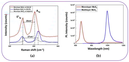 The structural properties of MoS2 are precisely analyzed through Raman and photoluminescence (PL) spectroscopy, providing important insights into the properties of materials. Figure 4a shows the Raman spectrum, an important indicator for analyzing the structural properties of MoS2. Two major peaks are important in the Raman spectrum. The first peak, indicated by E1 2g, is related to the crystal structure in the form of MoS2. The position and intensity of the E1 2g peak are greatly influenced by both the crystal structure and the thickness of MoS2. The second peak, designated as A1g, is related to interatomic vibration in the material. A1g is also influenced by crystal structure and thickness, and A1g is an indicator of material quality. In the Raman spectrum, the E1 2g and A1g peaks of the MoS2 monolayer were observed at 382 cm−1 and 402 cm−1, respectively, and the E1 2g and A1g peaks of the multilayer MoS2 were observed at 380 cm−1 and 407 cm−1, respectively. The E1 2g peak corresponds to the in-plane vibration mode, which is the vibration of Mo atoms and S atoms parallel to the layer, and the A1g peak corresponds to the out-of-plane vibration mode, which is the vibration of S atoms perpendicular to the layer. The distance between the two peaks represents the number of layers present in the MoS2 crystal, and as the number of layers increases, the distance between the two peaks increases due to interlayer vibration.