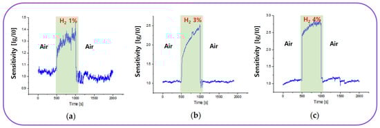 The sensitivity of the Pd-deposited MoS2-based hydrogen sensor using H2 concentration at room temperature: (a) H2 concentration is 1%; (b) H2 concentration is 3%; (c) H2 concentration is 4%.