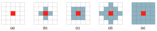 Neighborhoods for plane problems: (a) empty; (b) von Neumann; (c) Moore; (d) MvonN; (e) extended Moore.
