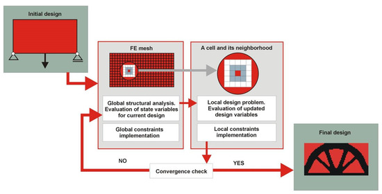 To illustrate how the TABASCO algorithm works, introductory examples have been proposed and detailed calculations are presented in this section. The Cellular Automata method allows for two approaches: simultaneous analysis and design, or the sequential approach chosen in this paper. So, the analysis using the finite element method is performed first and the design updating scheme is applied separately at each iteration. The updated value of design variable for each cell is based on the states of the neighboring cells determined in the preceding iteration, according to the Jacobi iteration scheme. The Moore-type neighborhood has been implemented. Each application of local update rules is preceded by finite element analysis performed using Matlab R2020b or Ansys 14 software. The diagram presenting the TABASCO workflow is given in Figure 3.