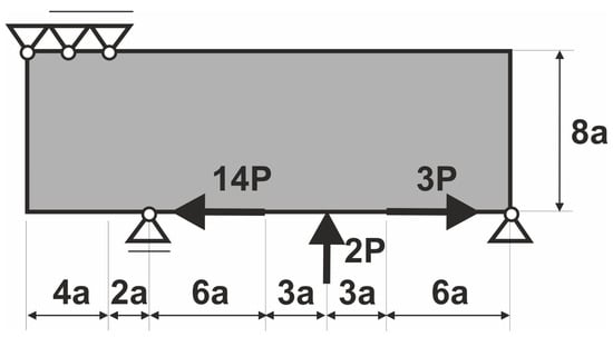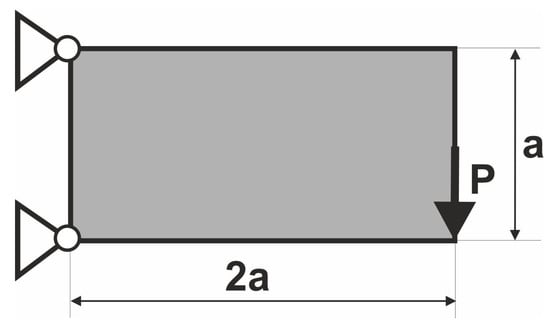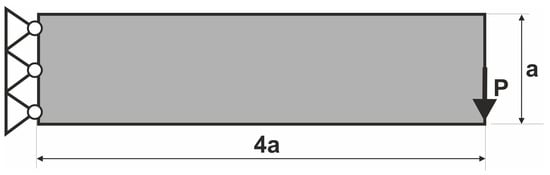 The values of parameters P and a equal P = 100 N and a = 10 mm, while the Young modulus and Poisson ratio equal E = 10 GPa and ν = 0.3, respectively. The assumed volume fraction for this example is 0.5. The finite element mesh consists of 19,200 square elements (240 × 80, regular mesh, 4-node elements, element edge length 1 mm).