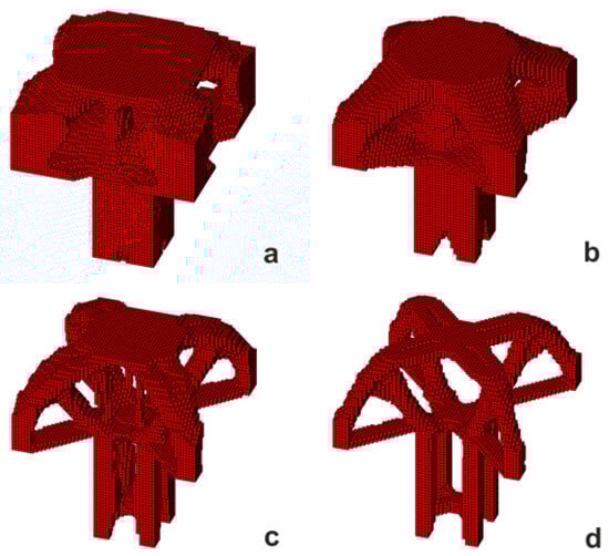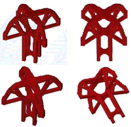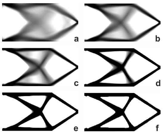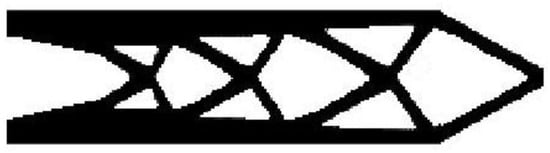 The m value is kept constant in the iteration process. The value of 0.2 is a common choice in the literature, e.g., [,]. The already-gathered experience from dealing with setting the move limit is that for its small values, the topology generation process slows down and the tendency of creating thin lines of generated topology can be observed. On the other hand, large values of the move limit change the structure topology and the compliance value, which may also cause the topology generation process to diverge.
