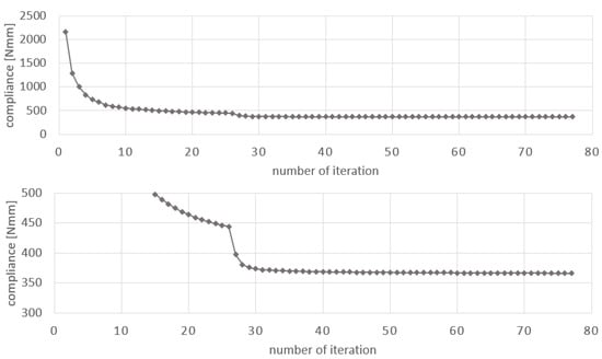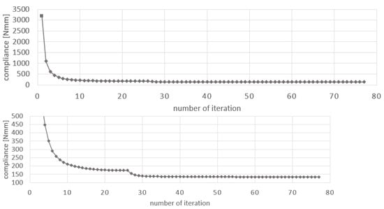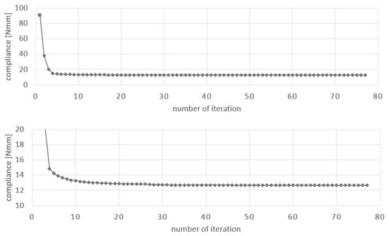 A large number of iterations has been performed for all examples to allow comparisons of its performance for all considered problems. It is also intended to underline a fast decrease in the objective and a stable behavior when approaching minimal value. In Figure 7, presenting compliance history, the additional figure for the narrow interval of objective function values has been added, which gives us a closer look at the compliance behavior.