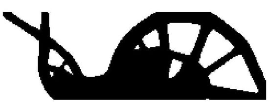 To complete the discussion of generating the optimized topology conducted for the test structure, the comparison with the results found using the well-known optimality criteria method [] was prepared. The final compliance for the mentioned code was 136.55 Nmm.