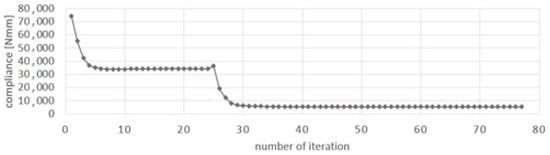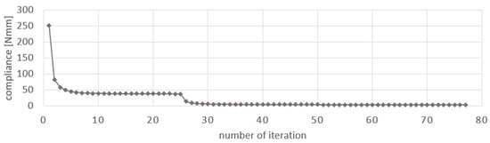 The structure is discretized using 31,000 8-node elements. The quarter of a structure is considered according to symmetry. For this example, the data are selected as E = 200 GPa and ν = 0.3. Four concentrated loads values of 1000 N each are applied. The assumed volume fraction equals 0.1. The calculation was performed for β = 0.1. The final layout of the structure with the resulting compliance equal to 2.46 Nmm is illustrated in Figure 16, while the overview of the topology generation process is presented in Figure 17. The compliance history is presented in Figure 18. To make a comparison with the method reported in the literature, the optimality criteria method was employed, and the final compliance obtained in this way equals 2.76 Nmm.