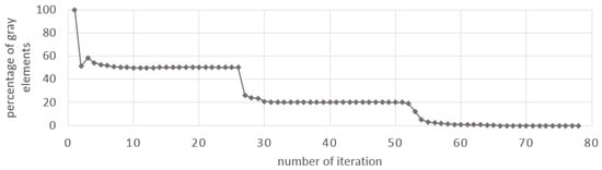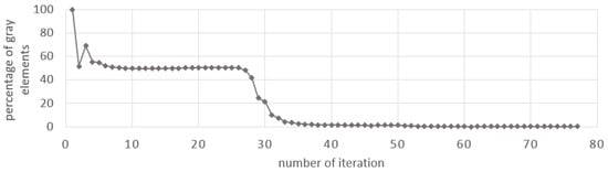 The gray elements are absent in the solution obtained with the proposed method, which is illustrated in Figure 19 by the change in the percentage of gray elements at each iteration step.