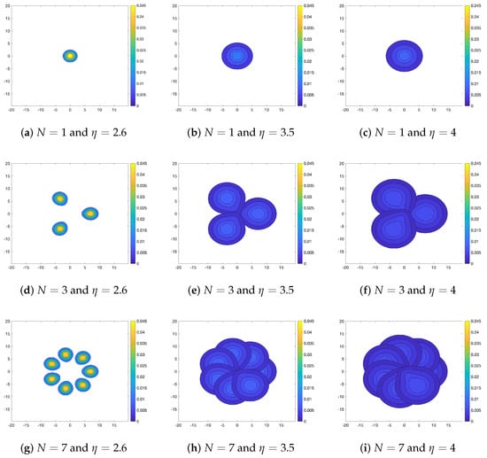 Note that we are assuming that and . In the simulations, we manipulate the parameters , a, and b. Recall that represents the strength of diffusivity. The two new parameters a and b are constants multiplying U and K, respectively, measuring the environment and interaction potential strength. Regarding the environmental potentials employed in these trials, we use a Gaussian function defined as , where A is a normalizing parameter ensuring that U integrates to one. The interaction potential is given by , where B is determined such that K integrates to one over the specified domain. The simulations share a common initial condition for each trial, denoted as . For , the initial position is set as . For , the initial positions are symmetrically distributed about a circle centered at the origin with a radius of five. The simulations were executed until the error for each equation in System (2), as described in Section 3.1, dropped below a predefined tolerance value of , chosen after running trials and calculating the difference between consecutive solutions.