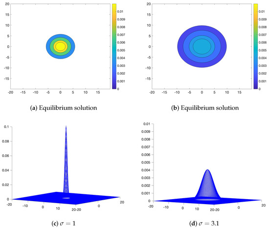 where f is the process of computing the right-hand side using the FFT and IFFT, as described above. We can solve for equilibrium solutions directly by setting in (8) for . To investigate the dynamics of the system, we can time step until we reach equilibrium. One can use Equation (8) and an ODE solver to find . In particular, we use the Runge–Kutta method in MatLab.
