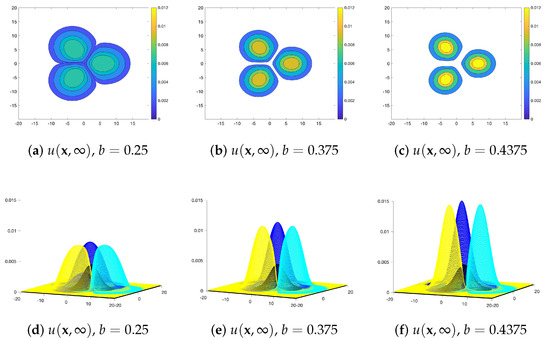 Next, we look at the scenario involving multiple groups. Figure 5 illustrates the case of three groups with and K a Gaussian with , and Figure 5 provides two views of the solution when the interaction potential strength is at its weakest and . We observe that as b increases the territories become more segregated.