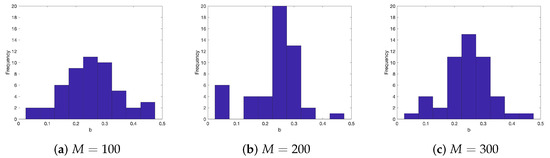 The histogram of estimated b values from 60 trials of SGD for various values of M, with data generated from , , . The average values from the simulations are 0.2537, 0.2342, 0.2464, respectively. The variances from the simulations are 0.0085, 0.0072, 0.0060, respectively.