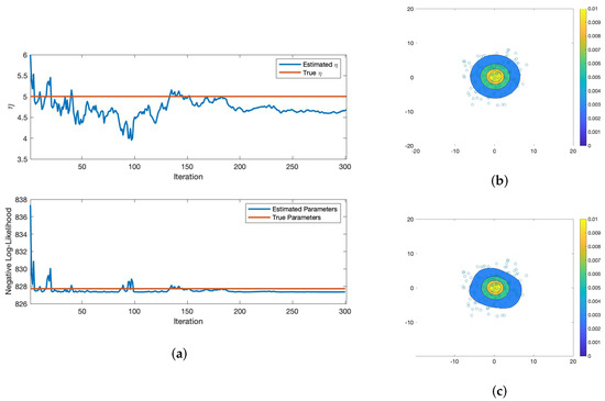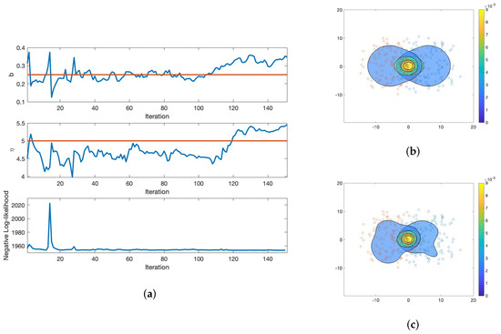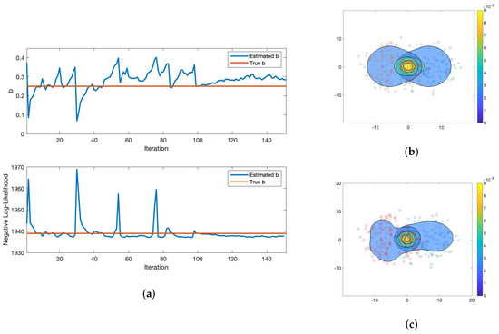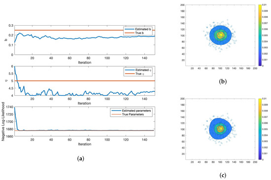 In Figure 10, we estimate b from data generated with , , in the case of two interacting species. In this case, the algorithm does not converge to the parameter the data were generated with, but converges to a parameter value that has a lower log-likelihood value. The parameter b is slightly overestimated, which leads to a more aggregated estimated territory in Figure 10c than the genuine territory depicted in Figure 10b. Additionally, the estimated territory has a higher maximum value and is less symmetric than the true territory.