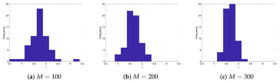 The histogram displays estimated values from 60 SGD trials for different M values, using data generated with , , and . The average values across simulations are 4.7295, 4.6357, and 4.6667, with corresponding variances of 0.1171, 0.0772, and 0.0462 for each case.