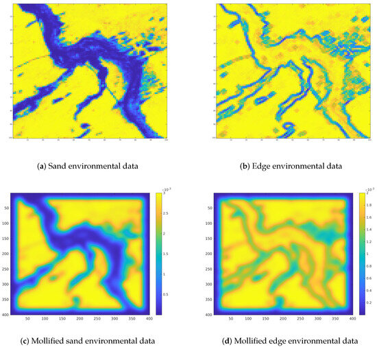 In practical applications, environmental data often exhibit irregularities and a lack of periodicity. In this section, we address these challenges and demonstrate our approach using relevant environments for meerkats from the study conducted by Bateman et al. (2015) [17]. We refer the interested reader to that study for detailed information about the data acquisition process for the meerkat habitat [17]. Notably, the type of sand and the interfaces between different sand types are believed to influence meerkat movement. The environmental data collected from meerkat habitats in South Africa, representing sand types and sand-type interfaces, are depicted in Figure 14a,b, respectively. For ease of analysis, the data has been normalized to a range between zero and one. In the case of sand-type data (Figure 14a), meerkats seem to prefer ferrous sand over clay sand, thus zero corresponds to clay sand, and one corresponds to ferrous sand. In the case of edge data (Figure 14b), zero represents the interface between different sand types, while one represents a distinct sand type. To address the irregularities in the environmental data, we apply a smoothing technique by convolving it with an approximation to the identity, resulting in a regularized representation denoted as U. This regularization process ensures uniformity throughout the data while preserving its influence on animal movement. The regularized environment functions are visualized in Figure 14c,d. Additionally, it is unsurprising that meerkat habitats lack periodicity, which poses a challenge for our numerical scheme that assumes periodic boundary conditions. To mitigate boundary effects, we extend our domain and set for locations x in the extended part of the domain. This extension is depicted by the blue border in Figure 14c,d.
