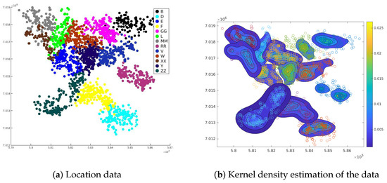 (a) The location data of meerkats are presented within the same geographical area as depicted in Figure 14. Each data point corresponds to a sighting of a meerkat from a specific group, and the different colors represent distinct meerkat groups. (b) The distribution approximation of the meerkat location data via mollified kernel density estimation added to a small, positive constant.