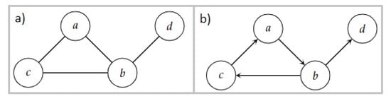 Complex networks are known as sets of interconnected nodes. The nodes of a network can be called vertices or elements and are represented by the symbols , where N is the total number of nodes in the network. If a node is connected to another node , this connection is represented by an ordered pair . The mathematical definition of a network (also called a graph) is as follows: Formally, a network R consists of a set of nodes and a set of ordered pairs . Each ordered pair is a directed connection from node to node . A non-directed type network consists of that for each pair there also exists the pair , as shown in Figure 1a. If the above is not fulfilled, the network directed, as Figure 1b. Illustrates. Nodes that are directly connected to a node are called ’s neighbors [20].