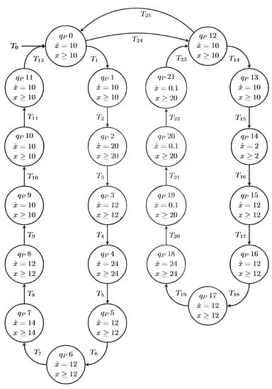 The hybrid automatas and share the same sets of states, functions and variables; however, the variables are from the virtual system and the variables from the physical system. The graphic representation of the automata is presented in Figure 3 and Figure 4.