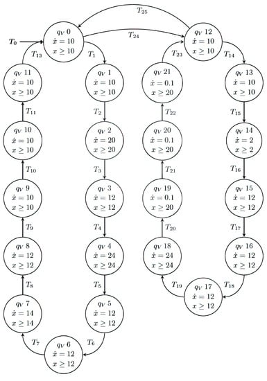 In the proposed cyber–physical system, there are two automata: , which is the physical hybrid automata, and , that is, the hybrid virtual automata, which is executed in a virtual system. is the synchronization time and is the Adjacency Matrix.
