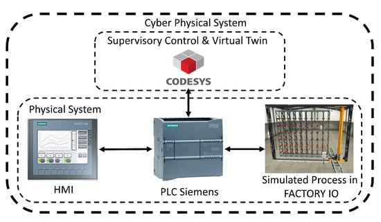 The cyber–physical system proposed here is composed by a communication structure between two systems, physical and digital systems. The physical system comprises a programmable logic controller (PLC), and a human–machine interface (HMI) interconnected to the supervisory controller through the PLC. The digital system comprises a supervisory control and a digital twin embedded in the digital system. The complete proposed CPS scheme is shown in the diagram of Figure 2.