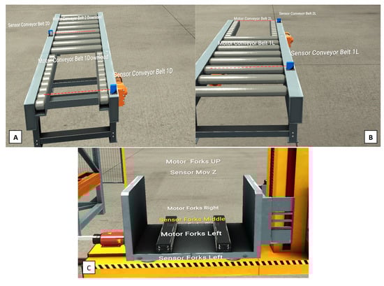 (A) Sensors and actuators in conveyor belt download. (B) Sensors and actuators in conveyor belt load. (C) Sensors and actuators in elevator base.