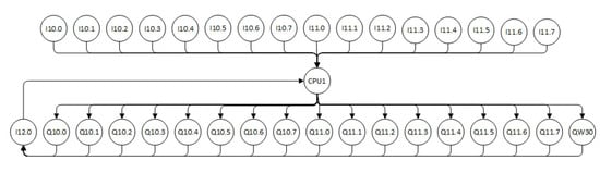 A complex network from an automatic warehouse model is presented. The elements of the storage system that are considered to perform the construction of the complex network are transducers and actuators such as buttons, contactors, motors, and PLCs, and are considered as nodes (Figure 7). The links are interpreted as the relationships between the elements and represent the electrical connection between the nodes of the network (Table 2 shows assignments of input and output ports).