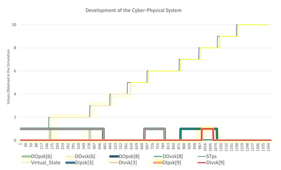 Cyber–physical systems are characterized by having a knowledge base in a virtual environment; therefore, to verify that the system is working in its optimal mode, the automata shown in the previous section are modeled with virtual variables, as shown in Figure 4.