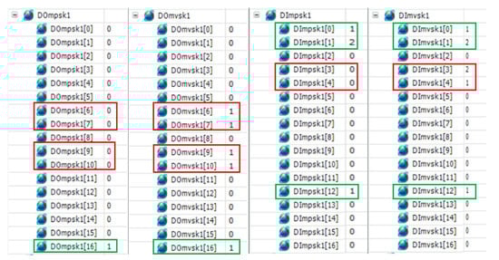 To corroborate the operation of the algorithm, the stored information presented in the Figure 9 was examined. In the case where there are no failures, the data vectors are identical, and in the case that the data are not equal, there are failures. Figure 11 shows the difference in the data vectors with red rectangles to indicate failures and the green rectangles to indicate that the elements are working correctly.