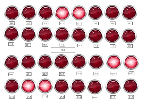 As can be observed in the adjacency matrix (Appendix A), only one column (strong blue) provides information on the actuators that have been activated by showing a value of “1” when the controller has activated them. The algorithms holds the information of activated outputs by means of a row arrangement (gray row). This arrangement of output elements can be represented as a vector. For the physical output, an array of physical binary outputs is defined, where each place represents the value of different output with corresponding physical PLC addresses. For the virtual system, there is a corresponding array of virtual binary outputs for simulated outputs , as follows: