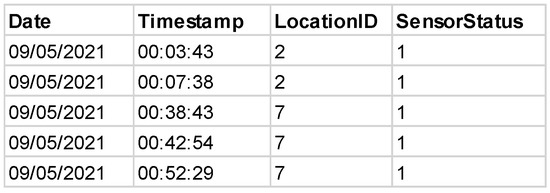 In the first part, the participant was given a brief introduction to the research and what was expected of them in this study. They were presented with a sample of the anonymised CSV file containing the data analysed (Figure 2). Each entry contains the date and time of an event, the location ID corresponding to a particular space of the house, and the sensor status, with “1” representing that the sensor was activated.