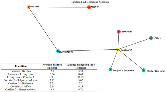 Then, they were shown a representation of the layout of the house where the monitored subject lived. This Tube-map visualisation of the house is a digitised pseudo map designed to make it easier to understand the possible transitions between rooms, e.g., adjacent rooms. To this end, the rooms are represented by circles of different colours, i.e., every bathroom is coloured pink and every bedroom green, and the possibility to move between two locations (which we define as a transition) is represented by a straight line (which we define as an edge), as shown in Figure 3. In addition, the average distance in metres between two rooms is also shown, calculated as the distance from the centre point of one room to the transitioning area, i.e., door, open wall, lift, or staircase, and from this point to the centre of the adjacent room. Finally, the average time it would take to cover this distance for a 70- to 80-year-old person is also indicated. It was explained to the participants that this information is obtained from the expanded Building Information Model (BIM) based on the original BIMXML model, which is a key enabler for the reusability of the process, regardless of the architectural characteristics of the house.