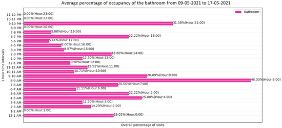 (a) Visualisation 1: This diagram shows a summary of the average percentage of sensor events (monitored resident visits) per time interval of 1 h in a selected location from the dataset. Overall, this visualisation aims to provide an insight into the times of day when the monitored subject is most likely to visit the location selected for the analysis, for example the bedroom in Figure 4. This visualisation uses a dynamic variable, the target location (e.g., the bathroom), which can be manually modified to adapt the information presented.