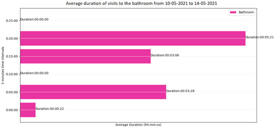 (b) Visualisation 2: This graph shows a summary of the average duration of the sensor events (monitored resident visits) at a selected location in 5 min time intervals for a selected time window (Figure 5). This diagram uses three dynamic variables that allow the information presented to be manually adjusted. These variables are the target location, and the start time and the end time of the time window requested for analysis (e.g., bathroom, from 00:00 to 00:25).