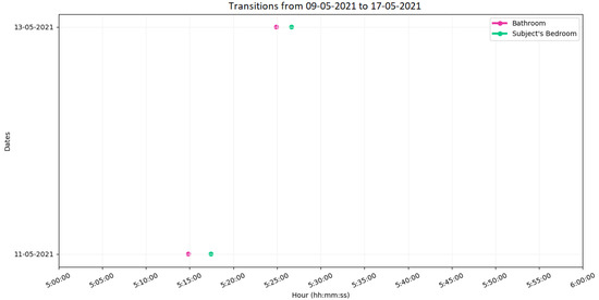 (c) Visualisation 3: This graph shows the sequence or order of locations that the monitored resident passed through between different days. In order to simplify the content of this graph, no time information about the duration of the events is shown. The time window over which the sequences are drawn can be manually selected by specifying the start and end times, e.g., from 05:00:00 to 06:00:00, Figure 6.