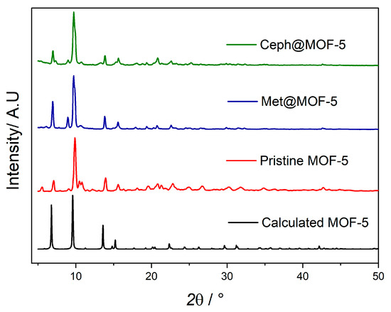 PXRD data were collected and compared with the calculated pattern for MOF-5 to investigate the crystallinity and phase purity of pristine MOF-5, met@MOF-5 and ceph@MOF-5, as shown in Figure 1. The PXRD patterns of the pristine MOF-5 were found to be consistent with those reported in literature, confirming the phase purity [41].