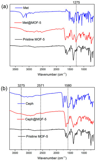 FT-IR spectra for Met, met@MOF-5 and pristine MOF-5 compared (a) with the characteristic peak of Met found between 1232 cm−1 and 1404 cm−1 of the met@MOF-5 spectra. IR spectra of Ceph, ceph@MOF-5 and pristine MOF-5 (b), with the characteristic peak of Ceph present at 1504 cm−1, confirming the presence of the drugs in their respective samples.
