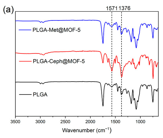 FT-IR spectra of pristine PCL, PCL-met@MOF-5 and PCL-ceph@MOF-5 (a) and IR spectra of PLGA, PLGA-met@MOF-5 and PLGA-ceph@MOF-5 (b) are shown.