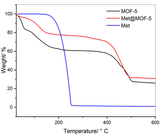 The PXRD patterns of met@MOF-5 appeared similar to the pristine MOF and showed all characteristic peaks of the pristine MOF-5, indicating that the crystal structure of the MOF after drug loading remained largely unaffected and the presence of the drug molecules did not alter the lattice parameters of the MOF [42,43].