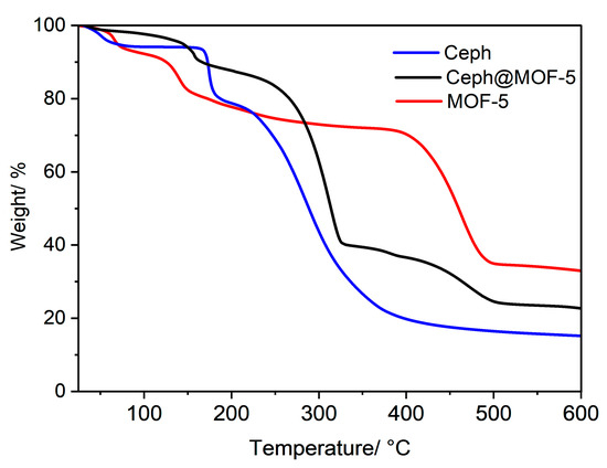 As expected, the TGA plots of the pristine MOF-5 indicated four distinct weight losses [27]: between 52 °C and 82.5 °C (5%) due to the removal of water molecules; between 82.5 °C and 175 °C (10%) due to the removal of DMF molecules; the third weight loss was assigned to the partial degradation of the MOF-5 framework, between 175 °C and 412 °C (12%), while between 412 °C and 500 °C (42%) indicated the final weight loss due to the full degradation of the MOF-5 framework at that point [46,47]. For the met@MOF-5 crystals, the TGA plots showed no weight loss until 150 °C; the first loss was then between 150 °C and 178 °C (13%), and due to the loss of DMF molecules, the second weight loss occurred between 178 °C and 325 °C (25%) due to the degradation of the Met drug molecules, which is observed to have its degrading temperature of 180 °C, within this temperature range. This suggests that the drug was successfully loaded and present in the pores of the MOF-5. The total disintegration of the framework then occurs between 450 °C and 510 °C (32%) after which it remains constant until 600 °C. In the case of ceph@MOF-5 crystals, three major weight losses were observed. The first drop is from 50 °C to 173 °C (8%), which can be accounted for by the loss of water and DFM molecules; another major drop is observed between 175 °C and 327 °C (52%) due to degradation of the Ceph drug molecules. Compared to the TGA plots of Ceph, they have a similar degrading temperature range suggesting the presence of the Ceph molecules after successful incorporation. Then, another drop in weight from 327 °C to 500 °C (15%) was observed due to the breakdown of the MOF framework, and it remained constant until 600 °C.
