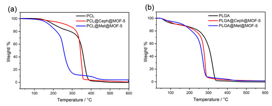 TGA plots of PCL, PCL-met@MOF-5 and PCL-ceph@MOF-5 compared, (a) and plots of PLGA, PLGA-met@MOF-5 and PLGA-ceph@MOF-5 (b).