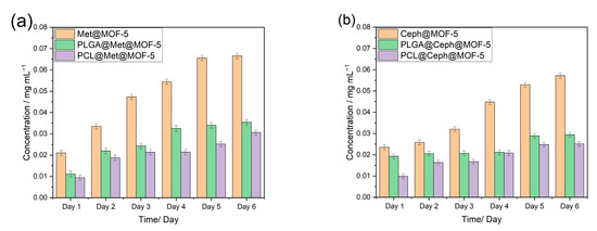 Release studies of drug-loaded MOFs and composites over 6 days for (a) met@MOF-5, PLGA@met@MOF-5 and PCL@met@MOF-5. (b) ceph@MOF-5, PLGA@ceph@MOF-5 and PCL@ceph@MOF-5.