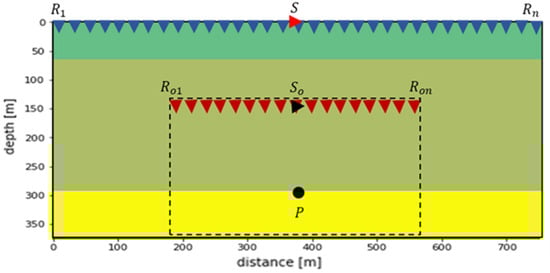 Therewith, seismic redatuming is used to simplify the recorded data and eliminate the overburden effects [26,27] by virtually relocating the acquisition surface beneath the complex geology, simulating the acquisition as if it were conducted at the redatumed level [28]. A seismic redatuming method was primarily used as a straightforward static correction, mainly applied on land seismic data, However, it has emerged as part of subsurface imaging to addressed challenges associated with the complex near surface conditions. The advantages of seismic redatuming have been increasingly acknowledged for achieving enhanced imaging and velocity model building compared to standard data processing [29]. Even with the existence of various redatuming methods, such as Wavefield Redatuming [30,31,32], and Marchenko redatuming [33,34,35,36], the fundamental principle remains consistent: dividing the subsurface into two distinct zones—the overburden and the target area. Then, the correction of transmission effects within the overburden is accomplished by employing a specific redatuming method to derive redatumed data.