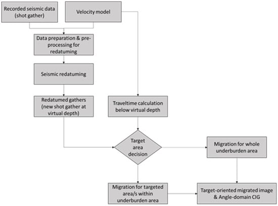 The first step involved establishing the virtual depth of the target area. The region above this virtual depth, often referred to as the datum, is termed the overburden area, while the region below is referred to as the underlying area. Next, the process involves retrieving the redatumed shot gathers from the initially recorded shot gathers through the application of seismic redatuming. For this step, any redatuming method can be employed to obtain the redatumed shot gathers, which will then use as input for the migration process.